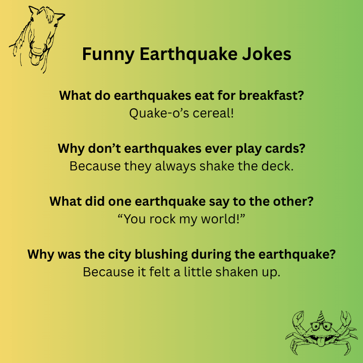 Get ready to shake with laughter! 🌎 Our collection of earthquake jokes is packed with puns, one-liners, and silly humor that will make anyone giggle. Perfect for kids, adults, or anyone who enjoys a lighthearted take on tremors and shakes, these jokes turn shaky situations into fun moments.